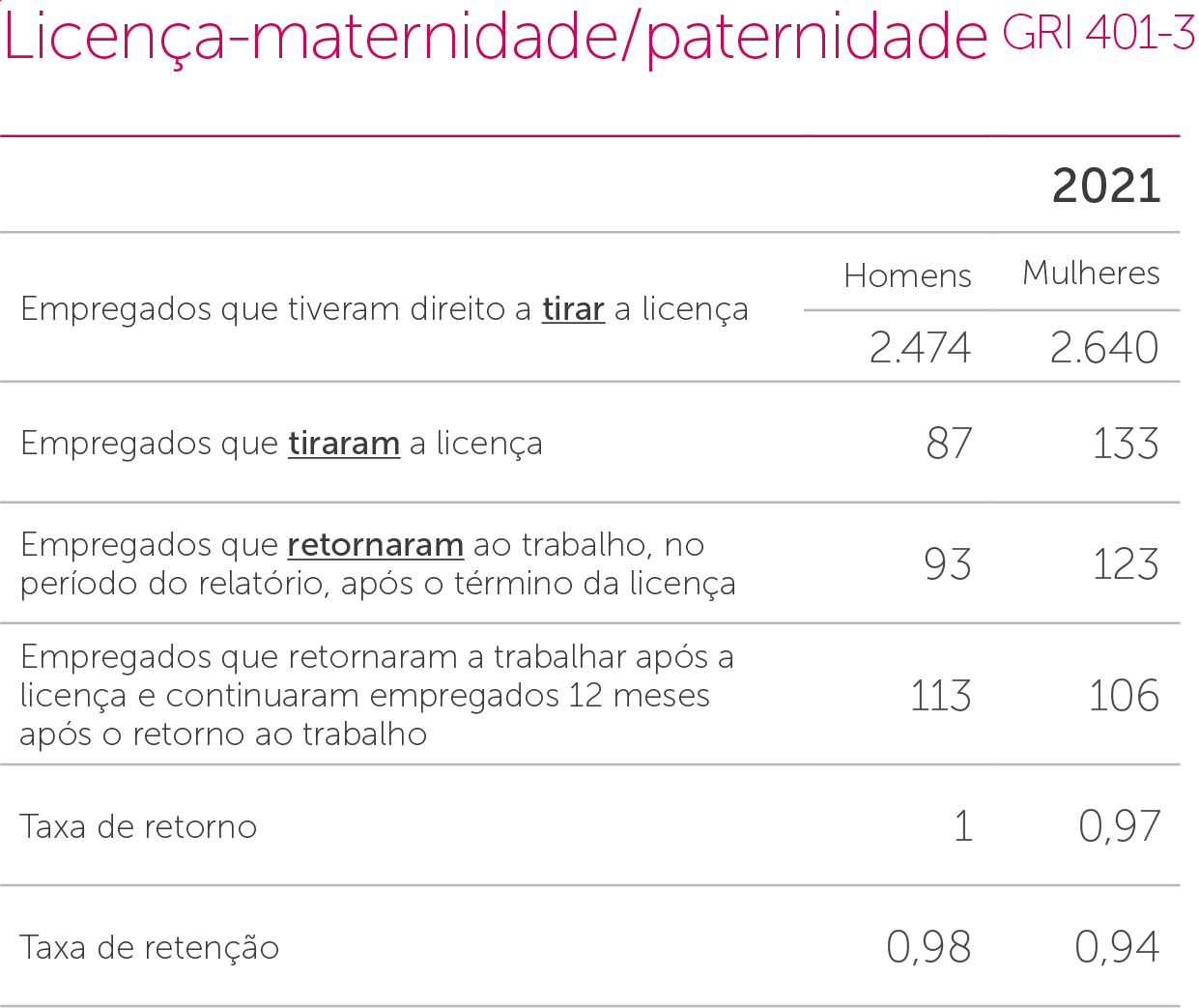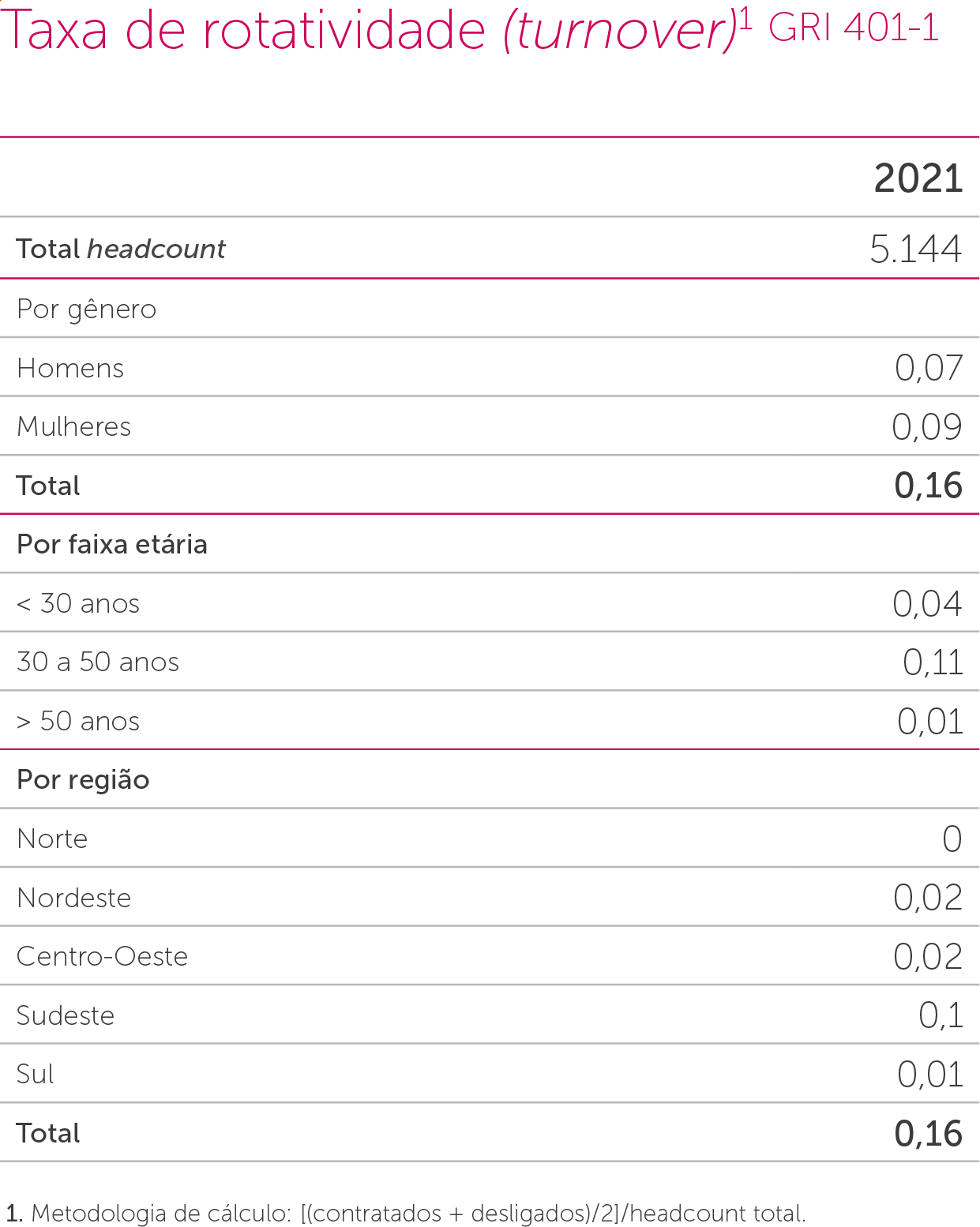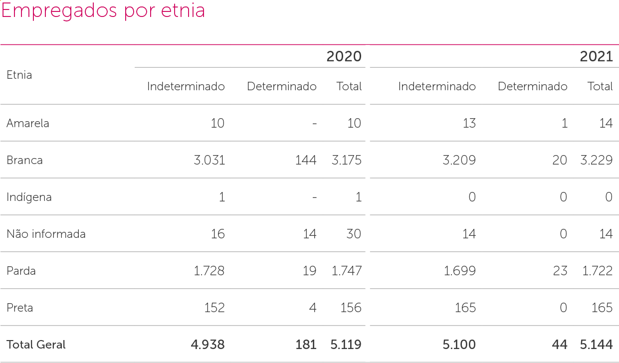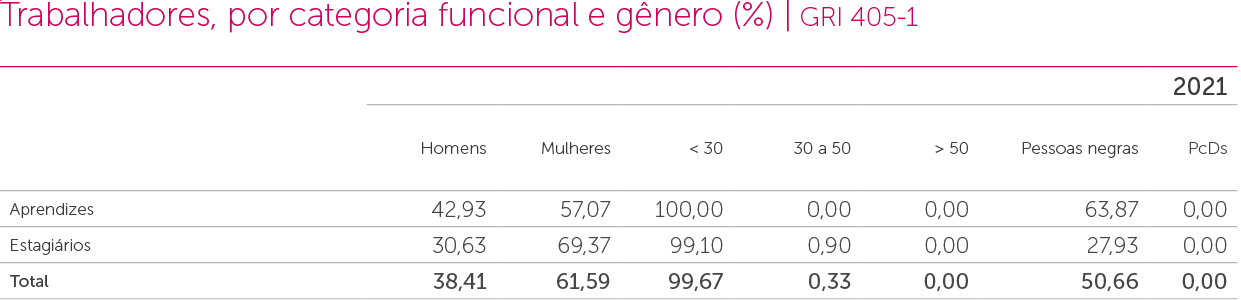 Reestruturamos e ampliamos nosso sistema de avaliação de desempenho – SGDI. Em 2021, 100% dos colaboradores da Companhia fizeram a avaliação de desempenho. Nosso modelo de avaliação é um aliado no desenvolvimento pessoal do colaborador, oferecendo clareza de critérios, equidade e feedback no resultado, o que é estimulante na construção da sua carreira. GRI 404-3