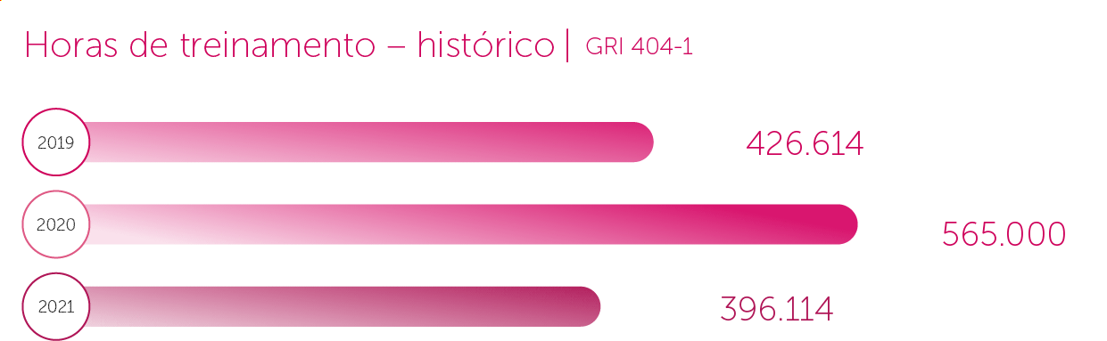 Em parceria com instituições educacionais de todo o país, os treinamentos somaram mais de 396 mil horas, o que representa uma média de 76,6 horas de capacitação por colaborador. GRI 404-1