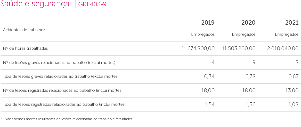 Assim fortalecemos nossa gestão com a certificação ISO 45001, que nos permite reduzir lesões e doenças ocupacionais em nossos colaboradores. Em 2021, não houve acidentes fatais, nem notificações de doença ocupacional GRI 403-2, 403-10