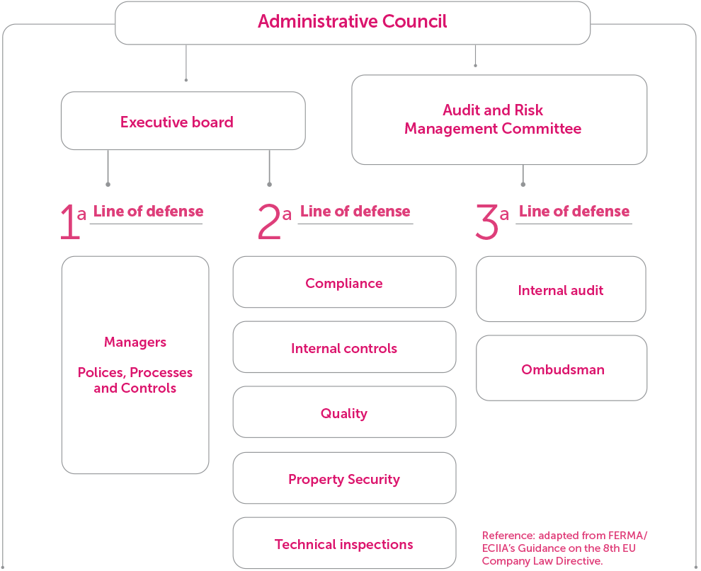 Our performance in risk management is established by the Three Lines of Defense model (reference: adaptation of ECIIA with Ferma’s Guidance on the 8th EU Company Law Directive), which resulted in a higher level of security in our environment, which enabled business areas, such as Risks and Compliance, Internal Controls and Internal Audit, to operate in an integrated and synergistic manner.