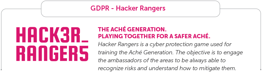 In the last year we integrated the data protection mechanisms with all areas in the Company, including having the Aché Generation sign an addendum. For the integration we mapped out each area in the company and appointed a GDPR ambassador as a focal point of information. We used an innovative tool called Hacker Rangers to train and engage with these ambassadors.