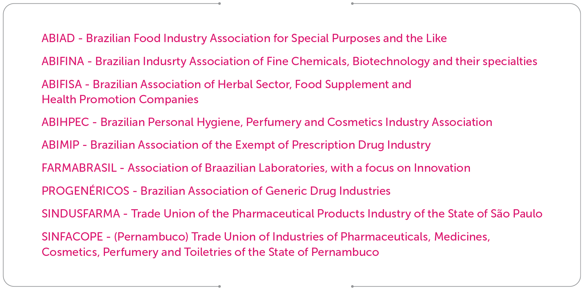 Conscious of our responsibility and contribution to the evolution of the pharmaceutical and health industry in Brazil, we maintain an ethical and transparent relationship with the public sector and the regulatory agencies of our industry, such as Anvisa. In order to make our contribution to important pharmaceutical subjects, we participate in the following sectoral associations: