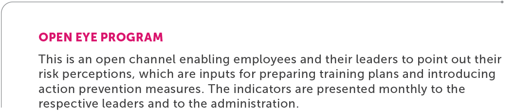 • Safety Dialogues: meetings held at least twice a week to provide guidance and collect reports of OHS occurrences.