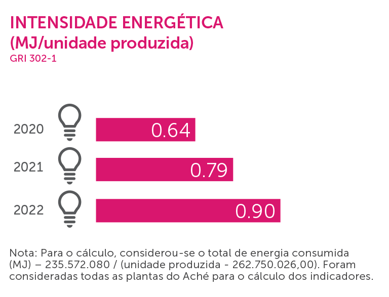 A estratificação das cargas elétricas demonstrou que a climatização foi a maior causadora do alto consumo de energia, representando 28,4%. Diante desse cenário, a unidade desenvolveu projetos de melhoria no sistema de climatização, o que representou uma redução de 1,9% no consumo de energia elétrica no ano de 2022. Em relação ao consumo total de energia (GJ) nas cinco plantas da Companhia, houve um aumento de 10% relacionado ao ano anterior, em virtude do início de operações da fase II (fabricação de sólidos) na Planta de Pernambuco e ampliação de área produtiva (microdosagem) em São Paulo.