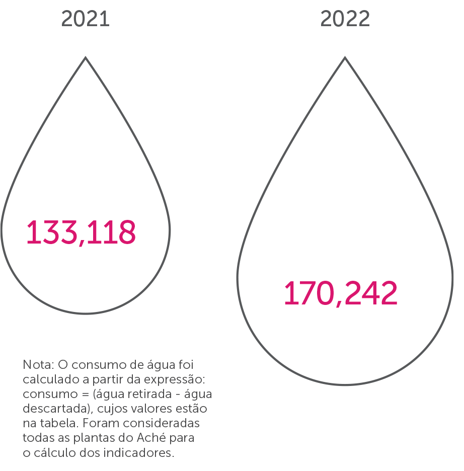 O fornecimento de água para o Aché acontece por meio de concessionária e captação própria em poços artesianos, tanto para processos produtivos quanto para consumo humano. O monitoramento do consumo de água é realizado por meio de indicadores, que se baseiam na leitura dos hidrômetros, faturas, planilhas e controle mensal das instalações prediais, cuja gestão é baseada na Política do SGI.